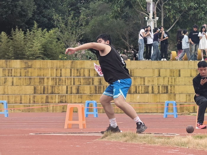 持球、预摆、推球,冼继培同学深深吸了一口气,紧紧握住铅球,臂膀肌肉紧绷,掂了掂重量,慢慢拖到耳边,用尽全身力气投了出去,力量与速度完美结合,铅球像离弦之箭一样飞出,划过了气氛热烈的现场,现场观众的目光紧紧跟随铅球的飞行,陷入了那短暂而又震撼的瞬间,划出了超远的抛物线,掌声、欢呼、呐喊,这一刻的精彩瞬间值得记录。最终,冼继培同学取得了男子铅球预决赛项目第八名的好成绩。