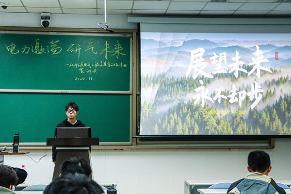 何振宇首先进行自我介绍,随后向大家分享有关保研的若干经验和建议,他结合自身经历向大家介绍了大学生创新创业大赛的相关情况并为大家提出了一些建议,为大家介绍了有关电气专业的竞赛以及对保研的影响。何振宇强调了专业课的重要性,表示不要因竞赛而耽误了平日里的学习。之后,郑彭帅上台进行学习经验的分享,对大学中绩点这一概念进行了介绍,并结合今年的保研情况进行了近一步解释。紧接着他就电气学科具体的课程为大家介绍了一些学习方法,方法包括对通识教育课和专业基础课以及专业课学习的指导,同时也介绍了与电气相关的专业课情况。