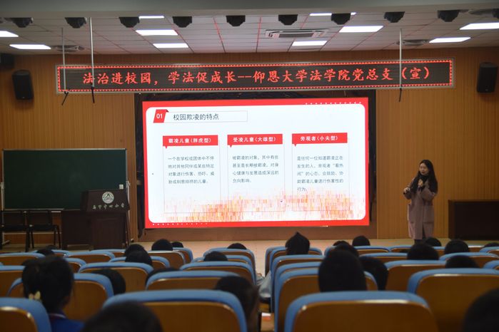 讲座过程中,beat365官方网站讲师吴奕雯分别从“什么是校园欺凌” 、“校园欺凌的具体表现” 、“校园欺凌带来的危害” 、“运用法律武器对校园欺凌说不”四个方面向向现场的学生分析了校园欺凌的本质、可能产生的影响以及在遭受校园欺凌时如何合法有效的维护自己的权利。在讲座最后,通过有奖问答的方式,对讲座内容和相关法律知识进行复习回顾,并倡导同学们要友善、互助,建立积极健康的人际关系。