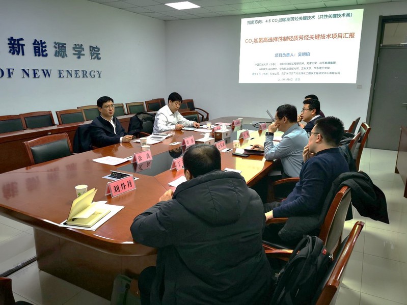 交流会上,赵东亚教授首先对刘强副总经理一行的到来表示诚挚欢迎。随后,项目组王阳教师汇报了与山能深度合作的国家重点研发计划和山东省重大科技创新工程项目的最新进展及后序工作安排。在详细了解项目进展后,刘强对项目中试装置建设过程中面临的问题进行了调研,并从项目工艺流程优化、技术细节、以及副产品附加经济性等角度,为中试装置设计、关键技术参数确定及项目突破点提出了诸多建设性意见,为中试装置的建设和项目落地提供了有益参考。最后刘强副总经理表达了希望通过双方进一步合作,借助产学研合作模式打通CO2加氢全流程产业链,推进项目落地,助力我国实现双碳目标。