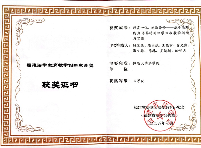 会议围绕传统与涉外法学教育问题、数字与人工智能法学教育问题、模拟法庭与法律诊所教育问题展开。同时,鲍莹玉副教授及其团队的“理实一体、德法兼修基于高阶能力培养的刑法学课程教学创新与实践”项目荣获第一届福建法学教育教学创新成果奖三等奖。
