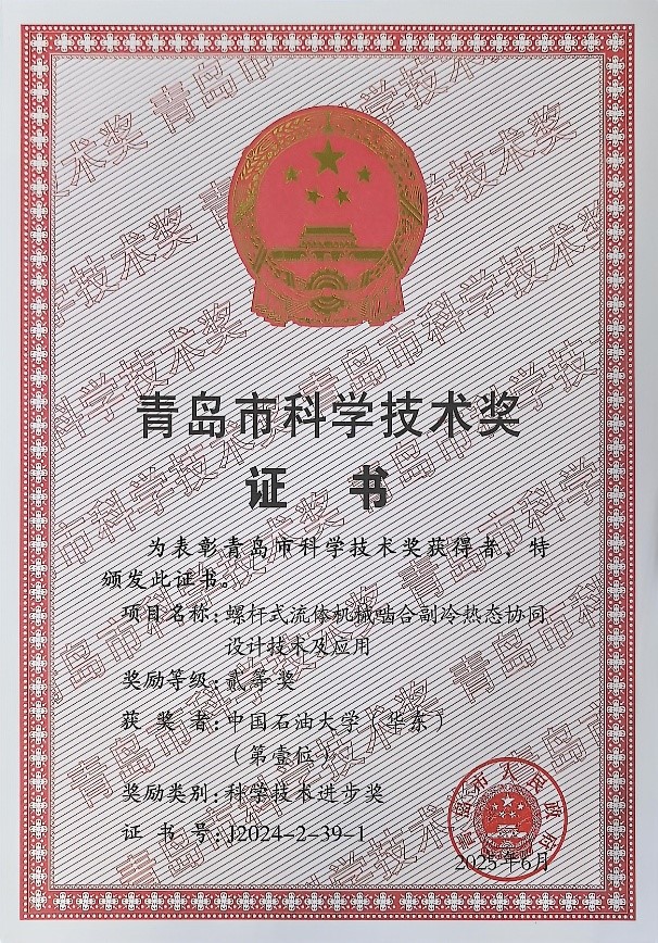 项目由中国石油大学(华东)主持,联合山东省特种设备检验研究院集团有限公司,经十余年科研攻关,形成了能效-可靠性协同控制的螺杆式流体机械流-热-固全耦合高效、长寿命分析设计方法,实现了技术和装备的自主研发。研究成果支撑开展了国内首台高饱和温升单螺杆蒸汽压缩机和全啮合自驱动盘式密封螺旋泵的创新研发,并被推广到其它类型回转式流体机械设计制造中。