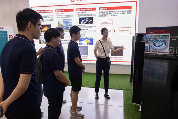 实践队员一拉开遮挡碲化镉发电玻璃的红色幕帘,玻璃上方的三盏灯泡随即亮起,这块1.92平方米的发电玻璃就开始源源不断产生电能。据讲解人员介绍,中建材碲化镉发电玻璃发电量高、损失小,能在光照差、温度高的条件下发电;平整度高,光泽度好,外观效果佳——能代替传统建材,满足绿色节能、增能建筑的要求,是推动我国绿色建筑体系建设,实现建筑节能减排的关键功能材料。