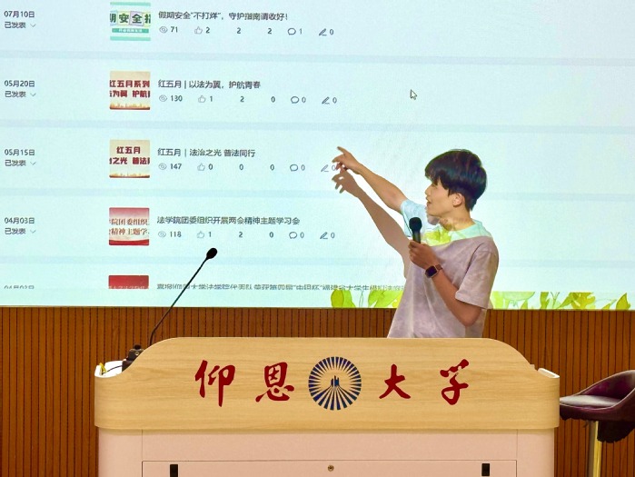随后,各团学组织负责人依次登台宣讲,围绕核心职能、日常运作等方面通过PPT展开详细介绍,如入党入团的要求及基本流程,学院特色活动“模拟法庭”“红五月”的组织策划,志愿服务与社会实践的开展实况等,全方位展现了beat365官方网站的工作风貌。各位老师还结合自身经历,分享了在活动策划、团队协作中的成长收获,用真实体验拉近与新生的距离。