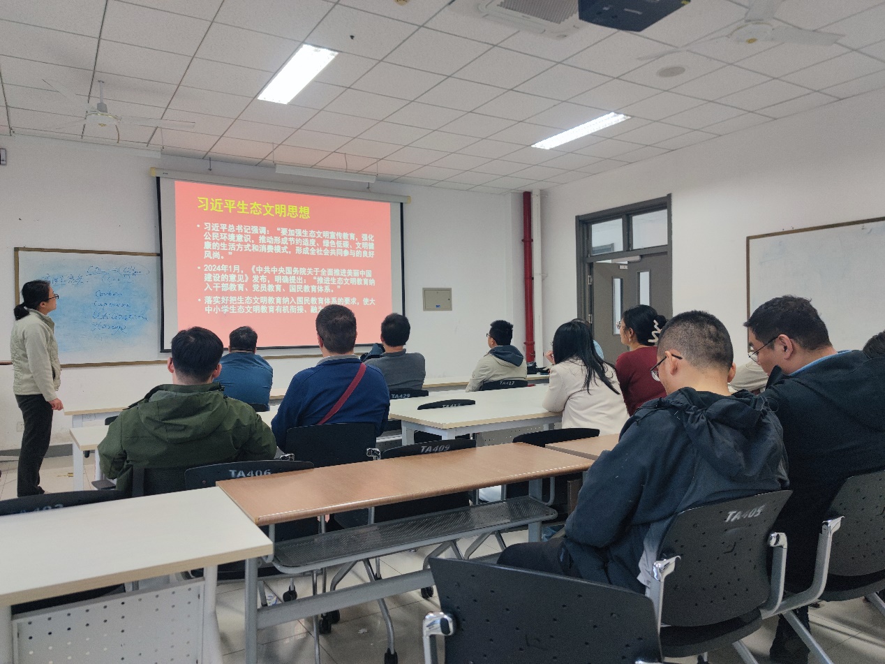 最后,值月党员曲燕老师以“习近平生态文明思想系列讲读”为主题,带领大家深入学习了习近平总书记关于生态文明建设的重要论述,特别是“绿水青山就是金山银山”“人与自然是生命共同体”“建设美丽中国”等重要理念。她结合视频资料和实践案例,强调要加强生态文明宣传教育,推动形成绿色低碳的生活方式,并指出高校教师应在教学科研中融入生态文明理念,引导学生将个人发展融入美丽中国建设大局。