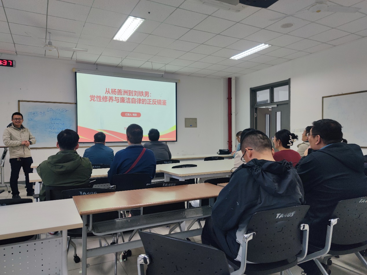 随后,杨滨老师以“从杨善洲到刘铁男:党性修养与廉洁自律的正反镜鉴”为题,通过正反典型案例对比,深刻剖析了新时代党员干部加强党性修养和廉洁自律的重要意义。他首先介绍了“草鞋书记”杨善洲退休后扎根大亮山植树22年,将价值超3亿元的林场无偿捐献国家的感人事迹,展现了其理想信念坚定、严守权力边界、家风严谨的高尚品格。并通过反面典型案例揭示理想信念动摇、组织观念淡薄、权力滥用、家风败坏等,对党和国家造成的深层危害。通过鲜明对比指出:党性修养是立身之本,必须终身修炼;廉洁自律是护身之盾,要从小事做起、管好身边人、敬畏手中权力,时刻筑牢拒腐防变的思想防线。