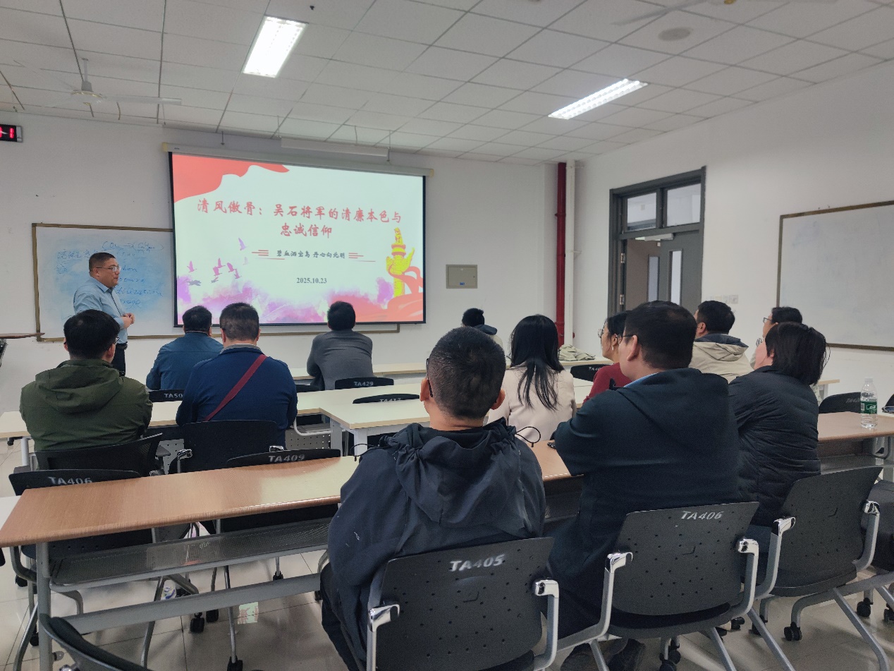 首先,李强老师以“清风傲骨:吴石将军的清廉本色与忠诚信仰”为题,讲述了隐蔽战线英雄吴石将军的光辉事迹。他通过详实的历史资料,回顾了吴石将军从辛亥革命投身军旅,到留学日本深造,再到担任国民党“国防部”参谋次长期间秘密为党工作的人生轨迹。重点阐释了吴石将军“布衣将军”的朴素生活作风——粗茶淡饭、简居陋舍、衣着朴素、生活节俭,并指出其清廉本色源于对共产主义理想的坚定信仰。在国民党政权腐败成风的环境中,吴石始终拒收贿赂、办事公正、财务透明,真正做到了“出淤泥而不染”。即便身陷囹圄,面对酷刑也坚贞不屈,最终慷慨就义,用生命诠释了对党和人民的绝对忠诚。吴石将军“碧血洒宝岛,丹心向北明”的崇高精神,深深震撼了在场每一位党员的心灵。