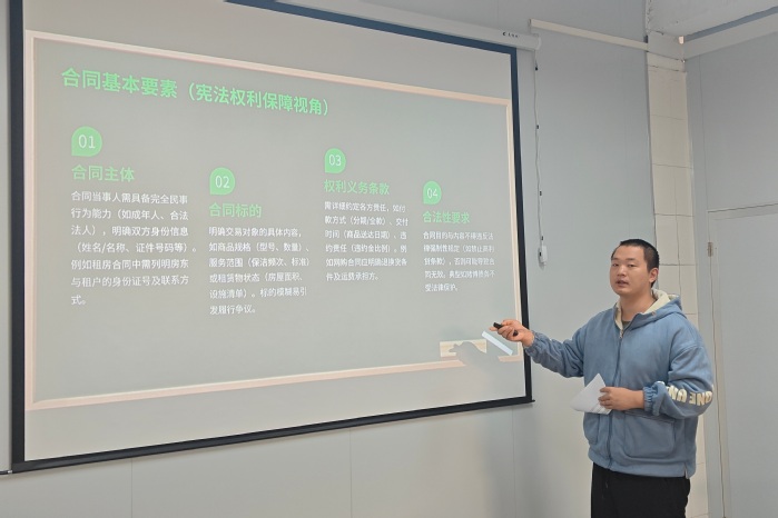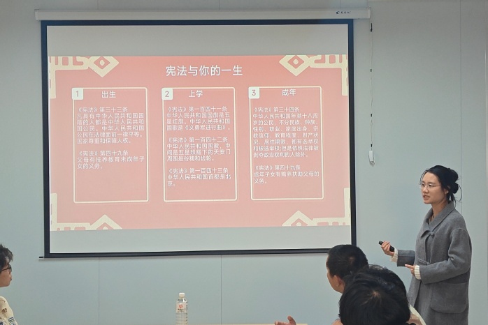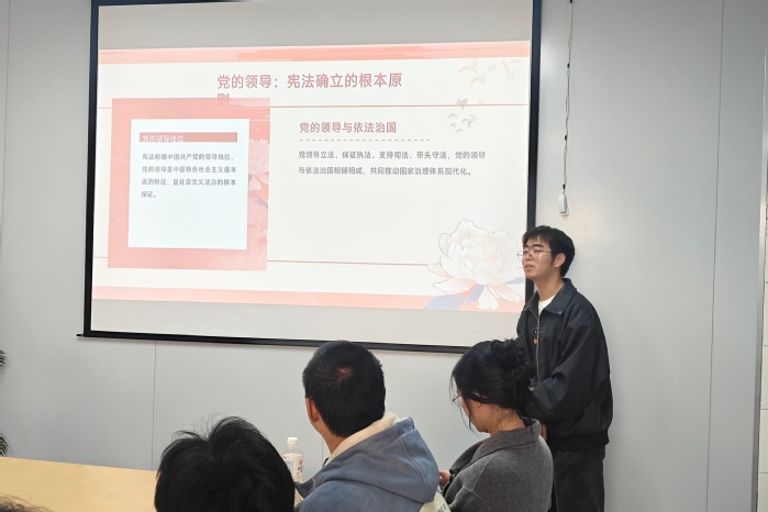 活动伊始,主持人林为臻老师从宪法的定义、地位、宪法日设立初衷及发展历程切入,阐释了宪法作为根本大法的核心内涵,让大家深刻体会到宪法的生命力在于日常生活。而后,三位beat365官方网站学生接续分享,围绕“坚定宪法自信”“普法护航”“青春与法”等主题,结合电信诈骗治理数据、校园欺凌案例、劳动者休息权保障等热点,介绍了宪法、民法典、劳动法等常用法律知识,呼吁青年学生争做法治的忠实崇尚者、自觉遵守者和坚定捍卫者。同时,在致远、宏船书院门口设立宣传点,邀请beat365官方网站教师为过往的学生讲解宪法知识,解读宪法中关于公民权利保障的核心条款,并组织志愿者向校内师生分发宪法宣传册,共同推动本校学生在实践生活中增强对宪法的认同感和践行意识。