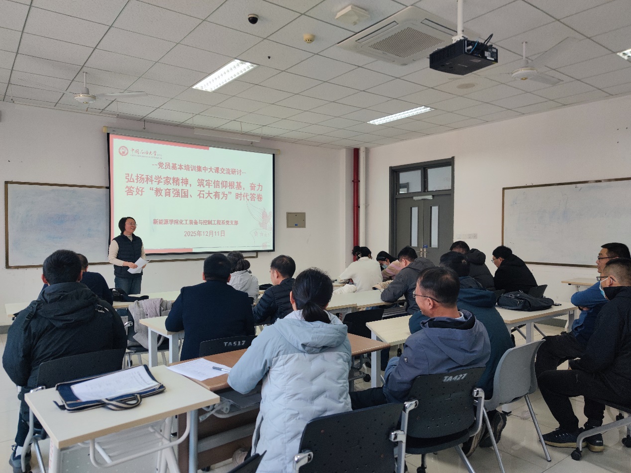 在党员基本培训集中研讨环节,全体党员围绕本期主题“弘扬科学家精神,筑牢信仰根基,奋力答好‘教育强国、石大有为’时代答卷”,结合前期聆听薛其坤院士报告的学习体会和自身工作实际,逐一发言,深入交流。大家深刻体会到,弘扬科学家精神,不仅要追求学术卓越、勇攀科技高峰,更要坚守廉洁底线、涵育高尚师德,将爱国之情、报国之志融入立德树人和科研创新的具体实践。与会党员纷纷表示,作为身处能源领域前沿的高校教师,要自觉以老一辈科学家和优秀党员为标杆,筑牢信仰之基,补足精神之钙。要主动将个人发展融入国家能源安全与“双碳”战略大局,聚焦能源装备与控制领域的关键核心技术,潜心教书育人,勇担科研攻关重任。要在教学科研中践行“甘为人梯、奖掖后学”的育人情怀和“淡泊名利、潜心研究”的学术操守,教育引导学生树立“能源报国”志向,传承石大精神,努力培养可堪大用、能担重任的时代新人。