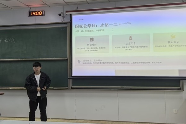 为引导同学们唤醒家国情怀、明确时代使命,同心共赴复兴路,12月10日下午,装控2501班于西环105教室成功举办了“铭记历史,同心前行”主题班会。班会由班长孙浩鑫主持,全班同学共同参与。